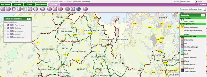 Cette application permet de mutualiser l'information géographique (Cadastre, Urbanisme, Réseaux) et de proposer des solutions par le WEB. Tout est basé sur des solutions logicielles libres et éprouvées par un grand nombre d'utilisateurs. L'information géographique répond au standard de l'OGC (Open Geospatial Consortium) afin de garantir l'interopérabilité des contenus et est conforme à la directive européenne INSPIRE (GéoBretagne).